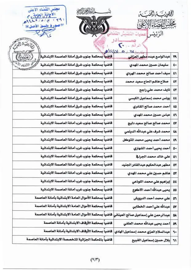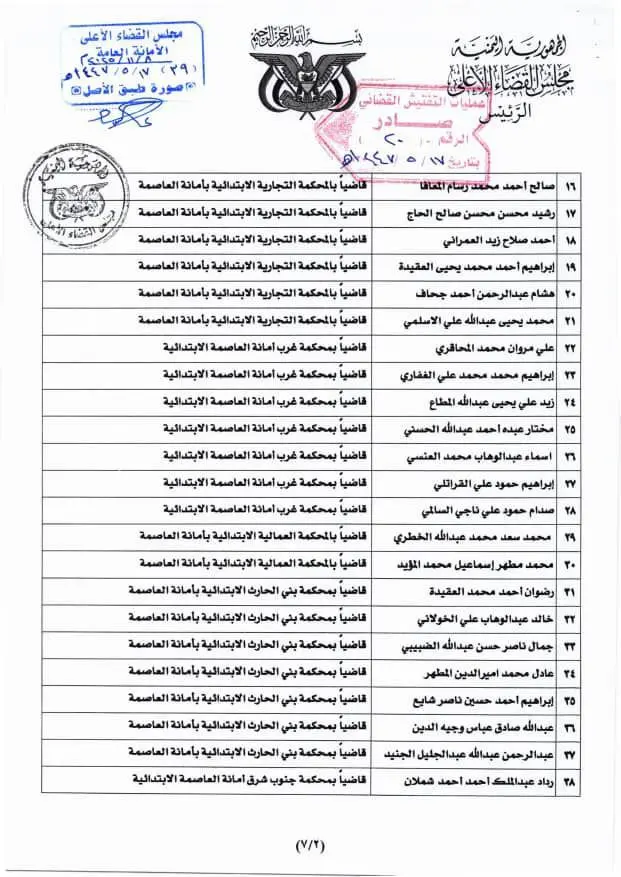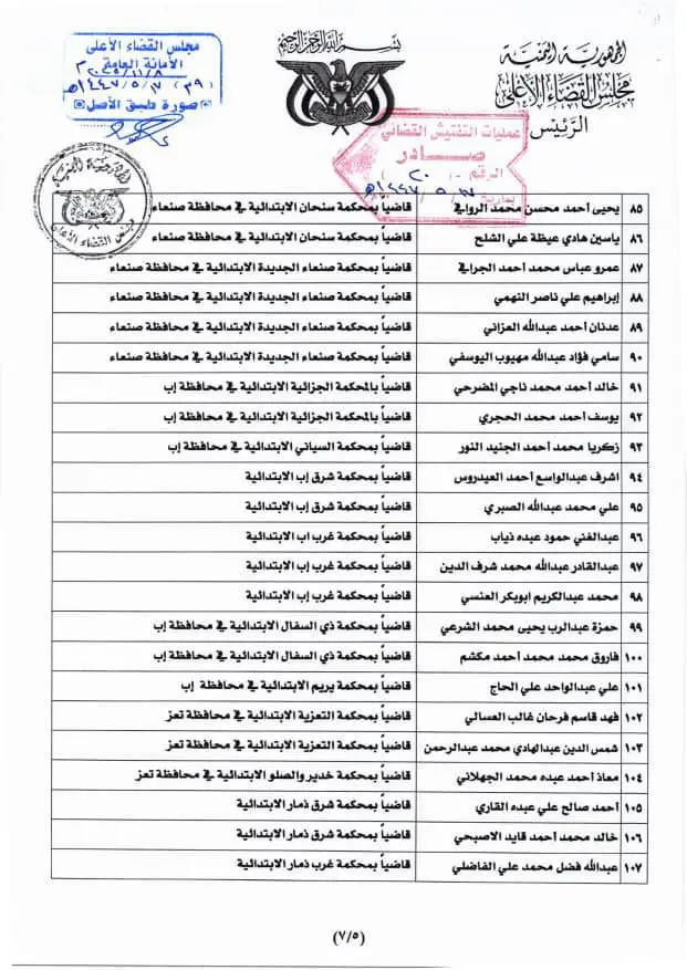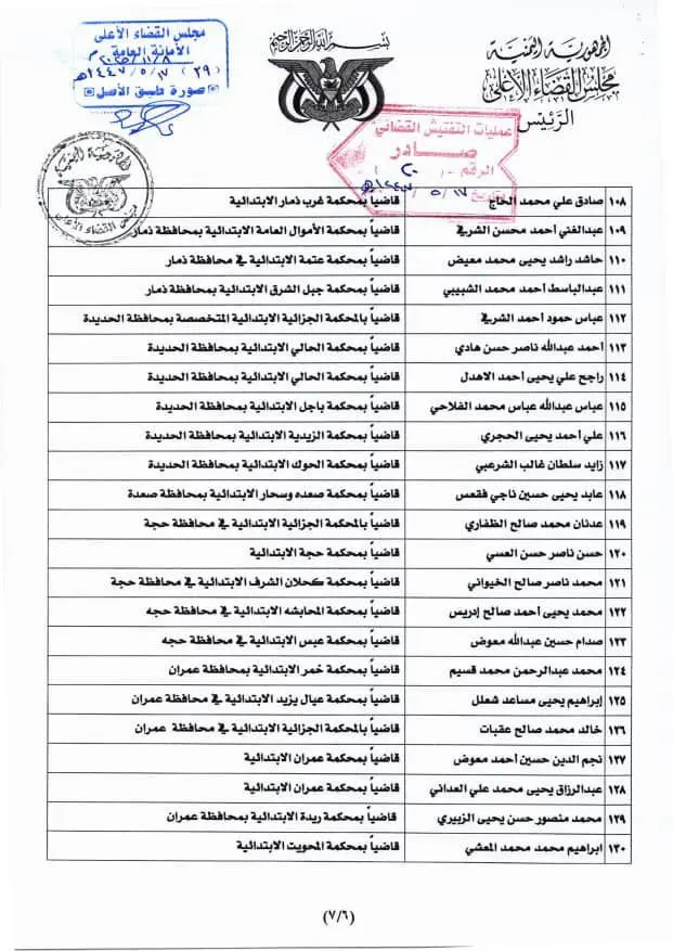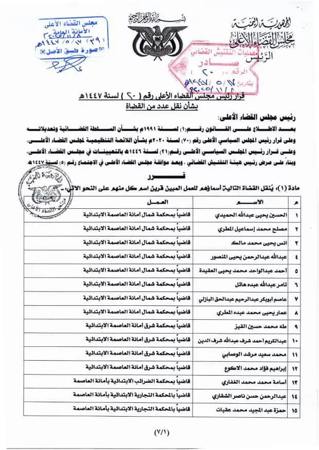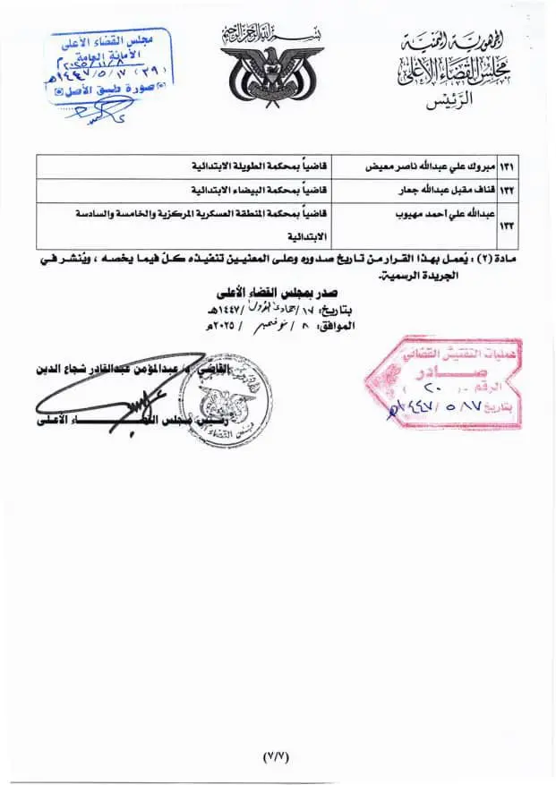 صدر اليوم قرار رئيس مجلس القضاء الأعلى القاضي الدكتور عبدالمؤمن شجاع الدين رقم "20"لسنة 1447هجرية، ،بناء على عرض رئيس هيئة التفتيش القضائي القاضي الدكتور مروان المحاقري، وبعد موافقة مجلس القضاء الأعلى ،