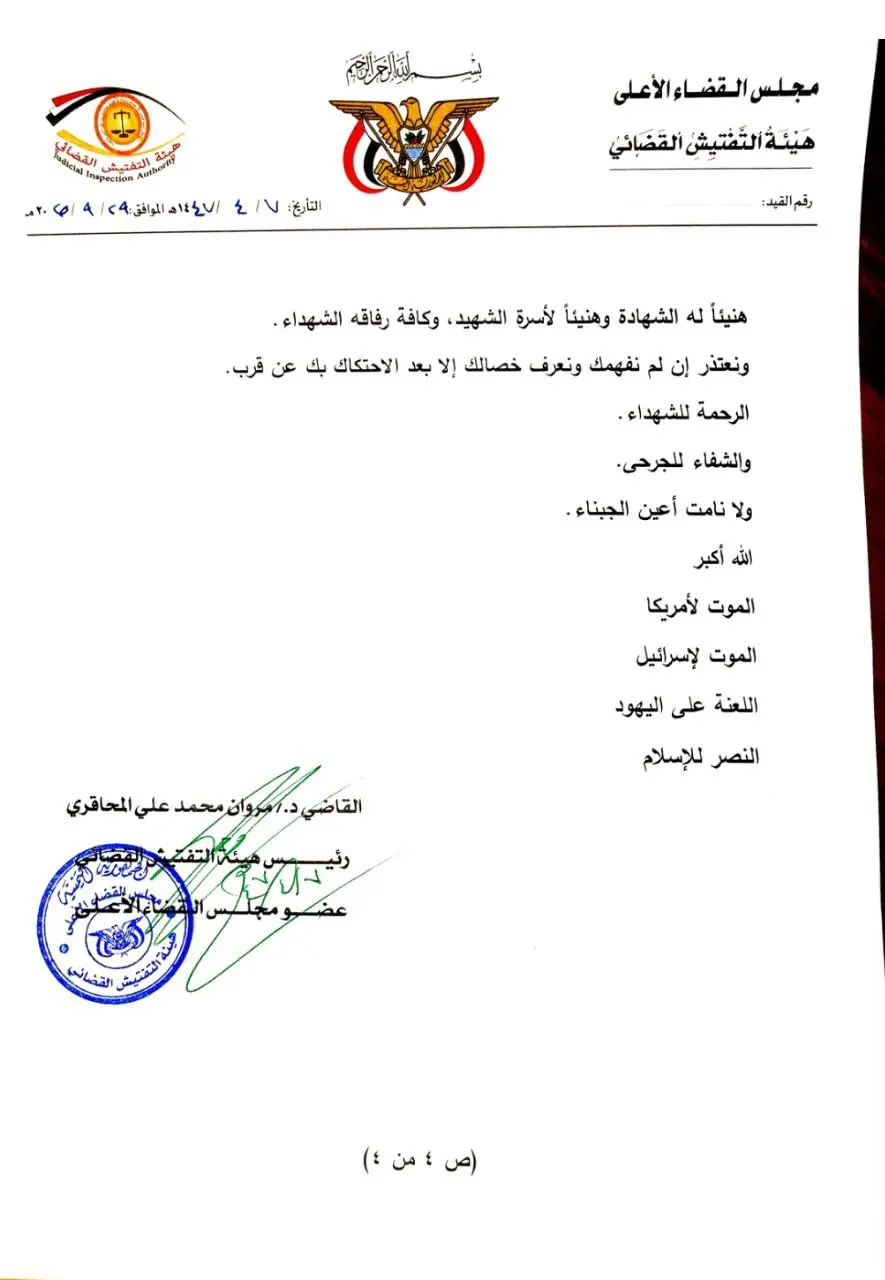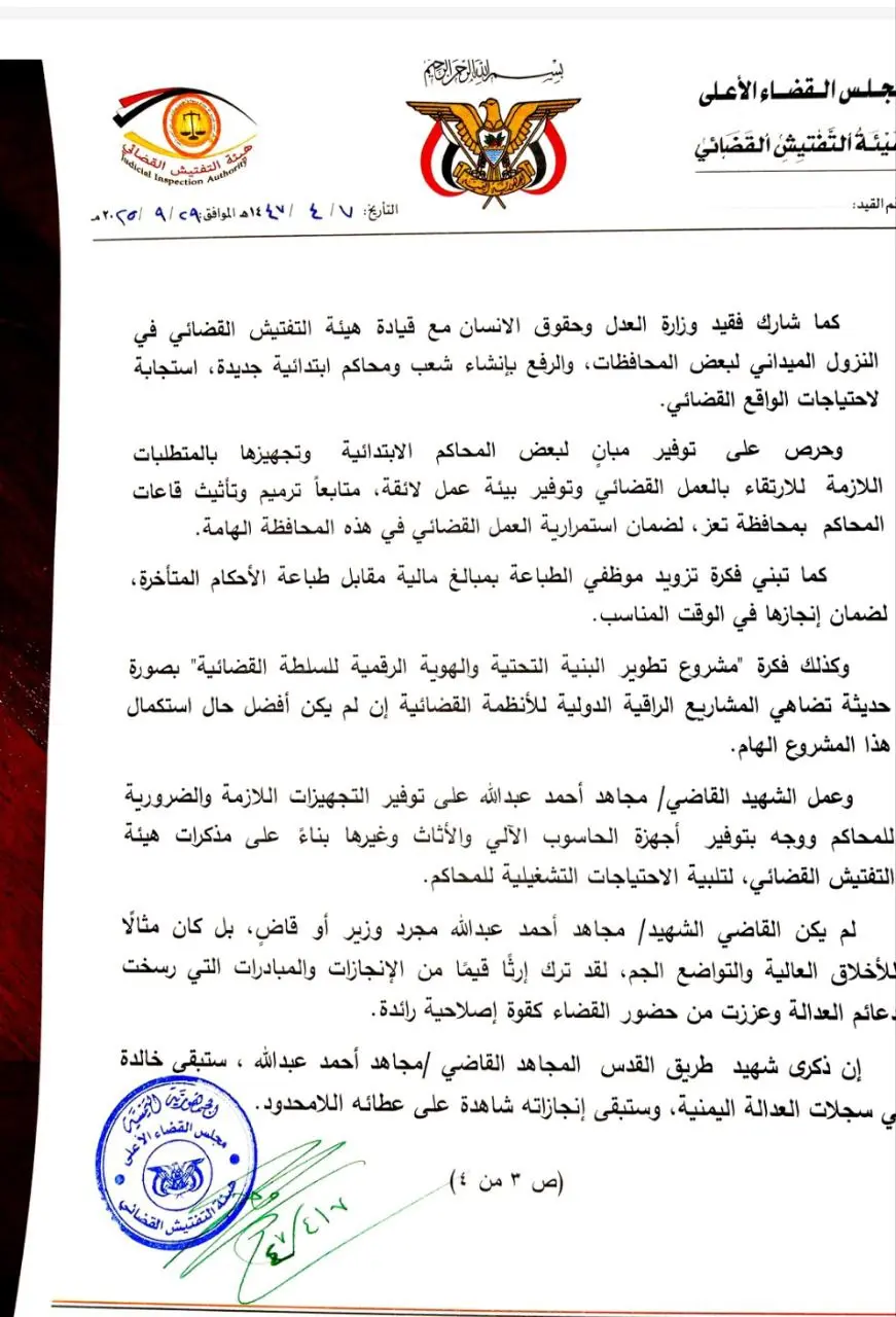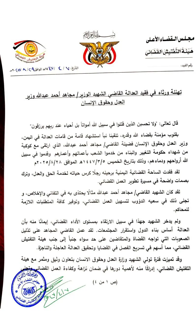 تهنئة و رثاء في فقيد العدالة القاضي الشهيد الوزير/مجاهد أحمد عبدالله-وزير العدل وحقوق الإنسان